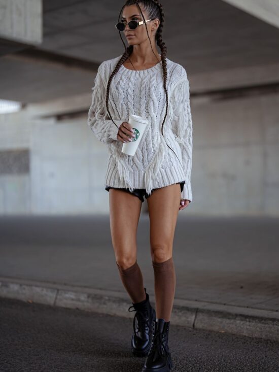 Zakolanówki ażurowe warkocz ze wstążką białe