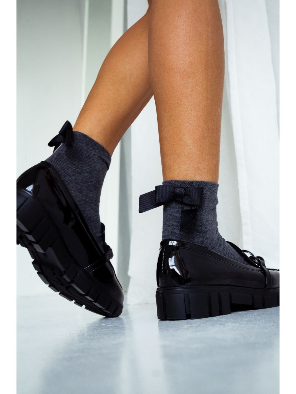 Skarpetki ciemnoszare z kokardką rypsową to gładka ciemnoszara skarpetka z uroczą rypsową czarną kokardą z tyłu.